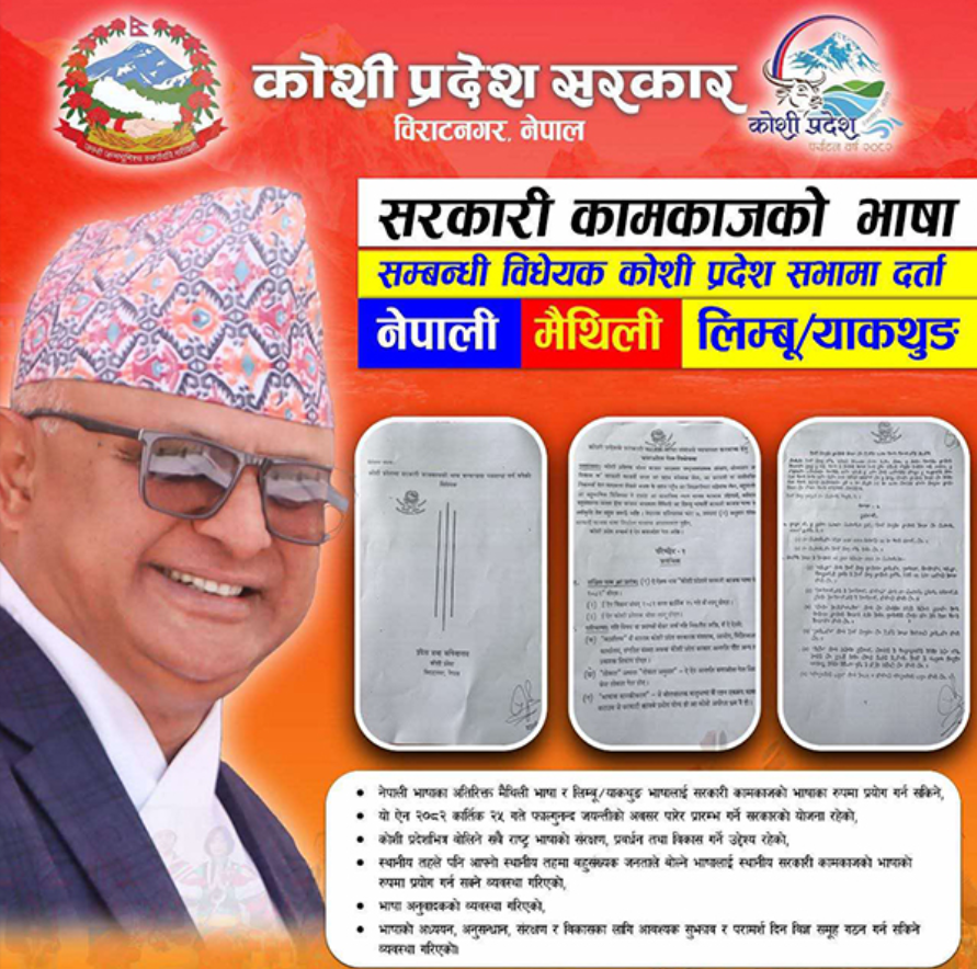 Biratnagar: The Koshi Province government has endorsed the ‘Koshi Province Bill to make arrangements regarding language of government function 2081 BS’.